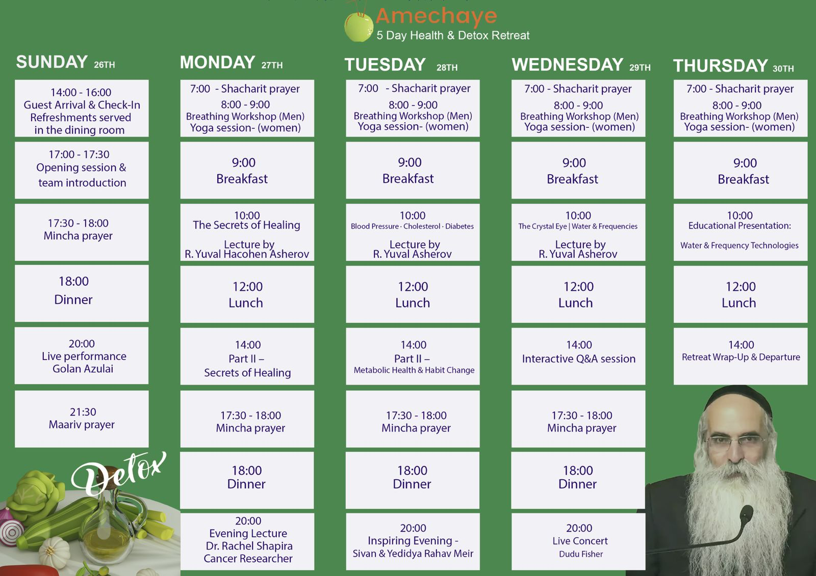 For the first time in Israel, Rabbi Yuval HaCohen Asherov will deliver two lectures per day over three consecutive days. Rabbi Asherov is known for his rare ability to bridge Torah wisdom with a deep understanding of the human body and natural healing processes. His talks address immune system strengthening, emotional resilience, stress management, blood pressure, diabetes, and the powerful connection between faith and health. On the fourth day, participants will take part in an open Q&A session, creating an opportunity for direct dialogue and personal guidance.