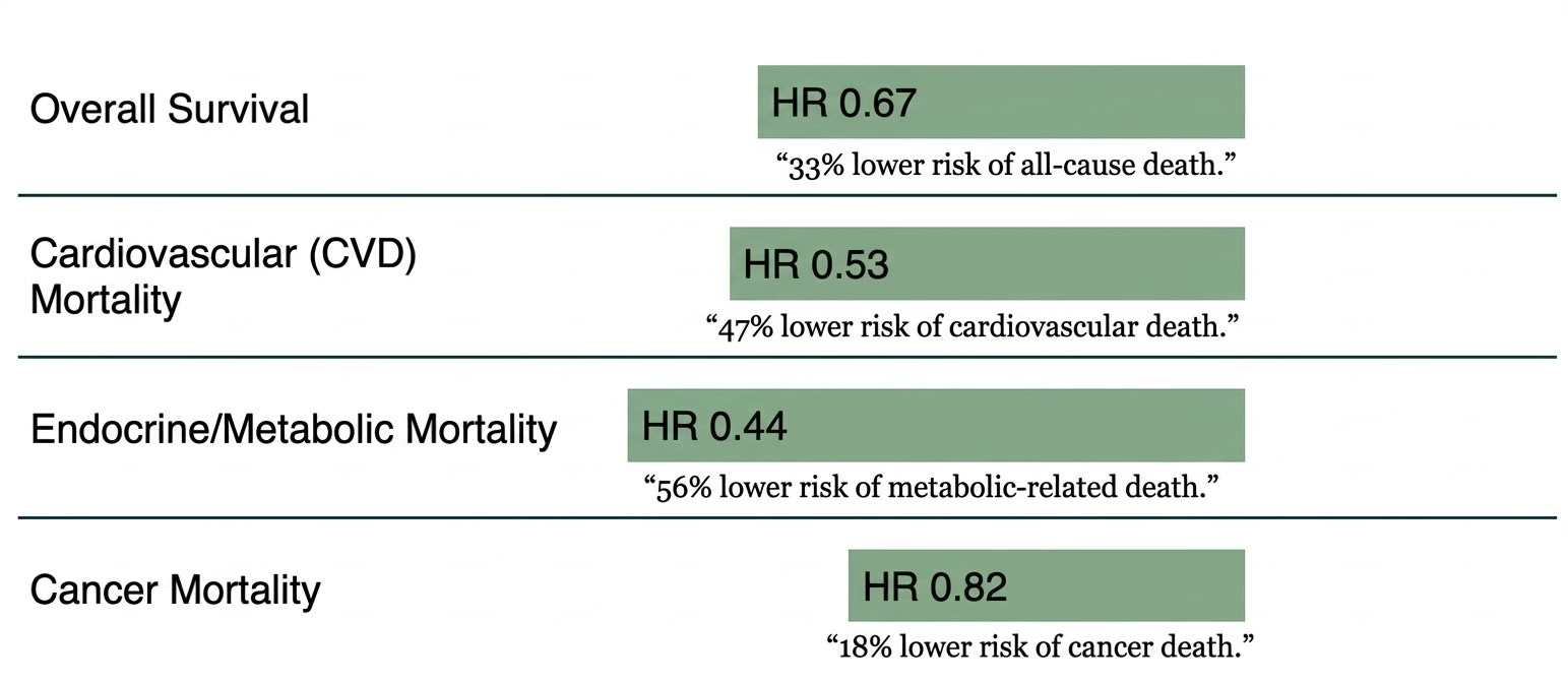 There are a lot of graphs in the paper for outcomes, for both the NLST and FHS cohorts. To simplify the major outcomes, below is a composite Figure with striking reduction of all-cause mortality and for the different causes of death. The results were consistent between the 2 cohorts. For example, the cardiovascular mortality hazard ratio average was 0.57 in NLST and 0.38 in FHS (weighted to be 0.53 for the aggregate). The reduction of mortality also extended to digestive diseases and pulmonary disease (data not shown below).