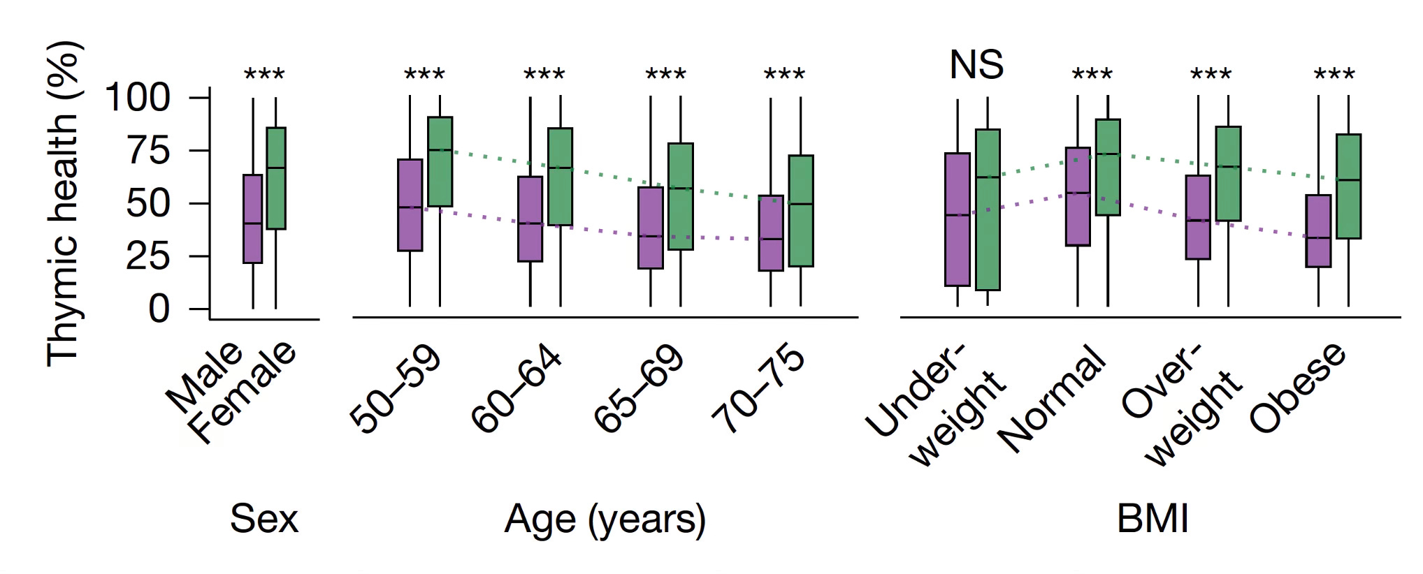From the NSLT, you can see below that increased age and body-mass index were correlated to reduced thymic health. And, overall, men had reduced thymic health scores compared with women.