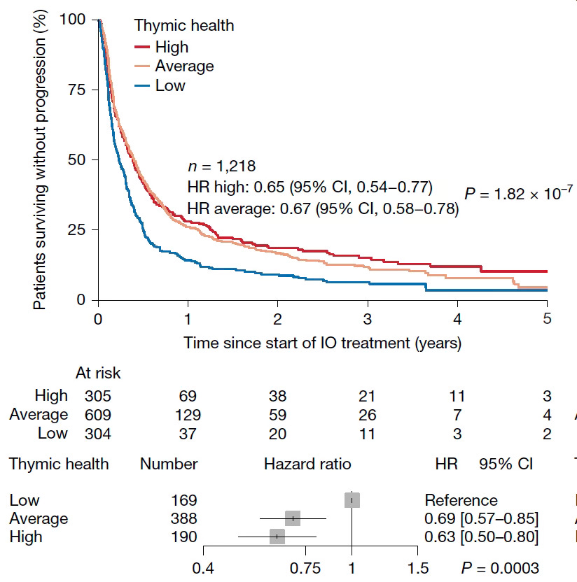 In their second paper, the same team looked at the relationship between thymic score and outcomes for 3,476 patients receiving cancer immunotherapy. The non-small cell lung cancer progression-free survival was reduced in patients with low thymic health score.