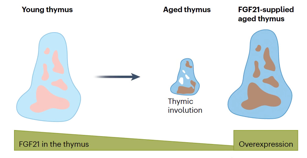 Increased thymus FGF21 led to increased CD8 T cells in old mice and extended healthspan and improved physical performance. Building on the previous FOXN1 data, ablation of β-klotho, the obligatory co-receptor for FOXN1, accelerated thymic aging. The benefit to FGF21 was confirmed in a companion paper using an FGF21 knock-in mouse model showing thymus enlargement and increased TECs throughout the lifespan. (schematic Figure below). The accompanying editorial for these 2 papers speculated: “The proposed link between age-associated thymus involution and organismal aging is intriguing, and suggests we might seek to achieve systemic rejuvenation by counteracting thymic involution.”