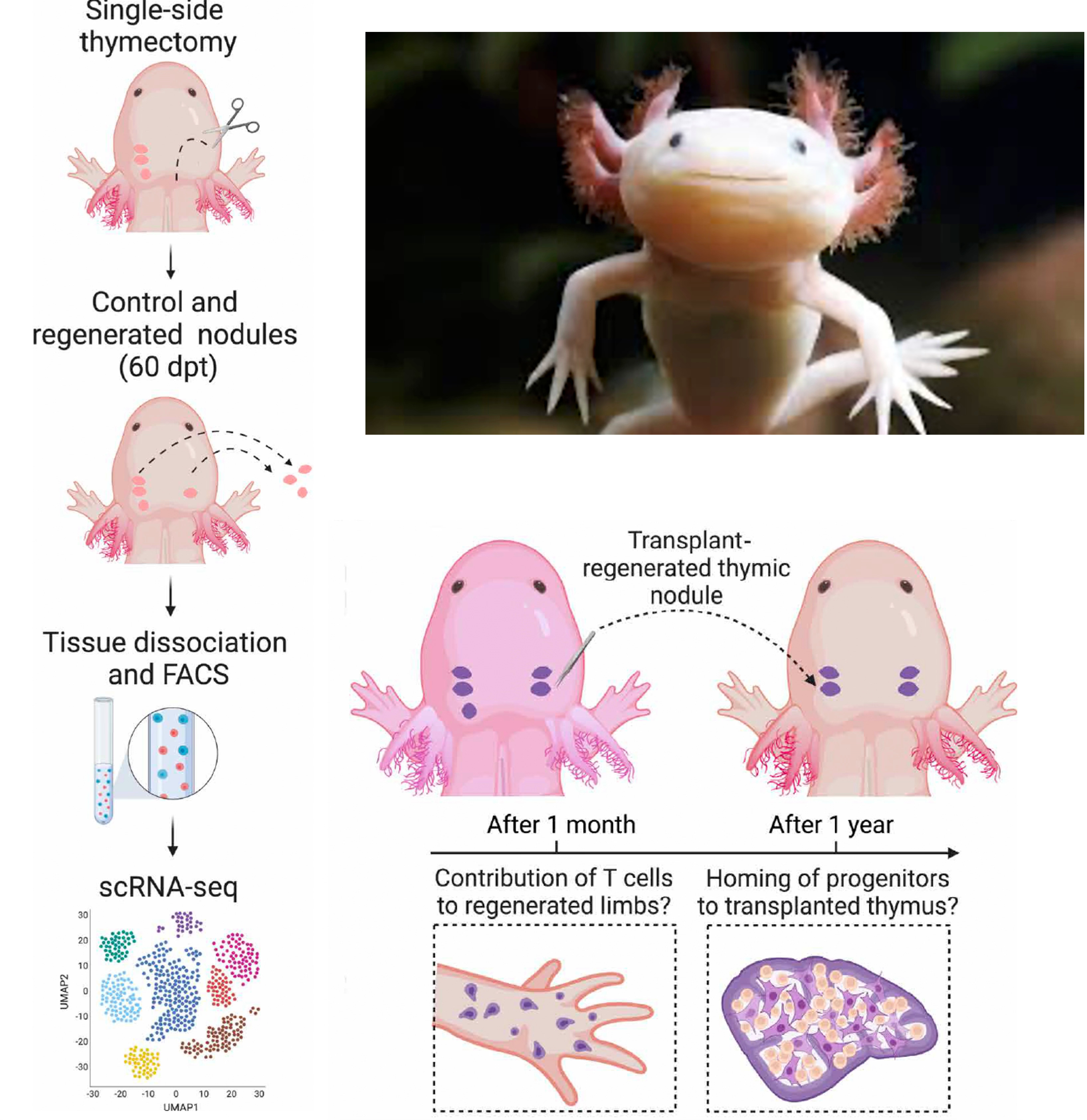 In an elegant set of experiments of the axolotl (Figure), known for its complete thymus regeneration after total surgical removal, mediators were identified. Surprisingly FOXN1 was dispensable. But midkine, a growth factor, appeared to be the driver, the initiator of thymus cell growth, survival, and repair. Other components that contributed were Postn+ (periostin-expressing mesenchymal niches) and Ccl19, a chemokine protein from the bloodstream.