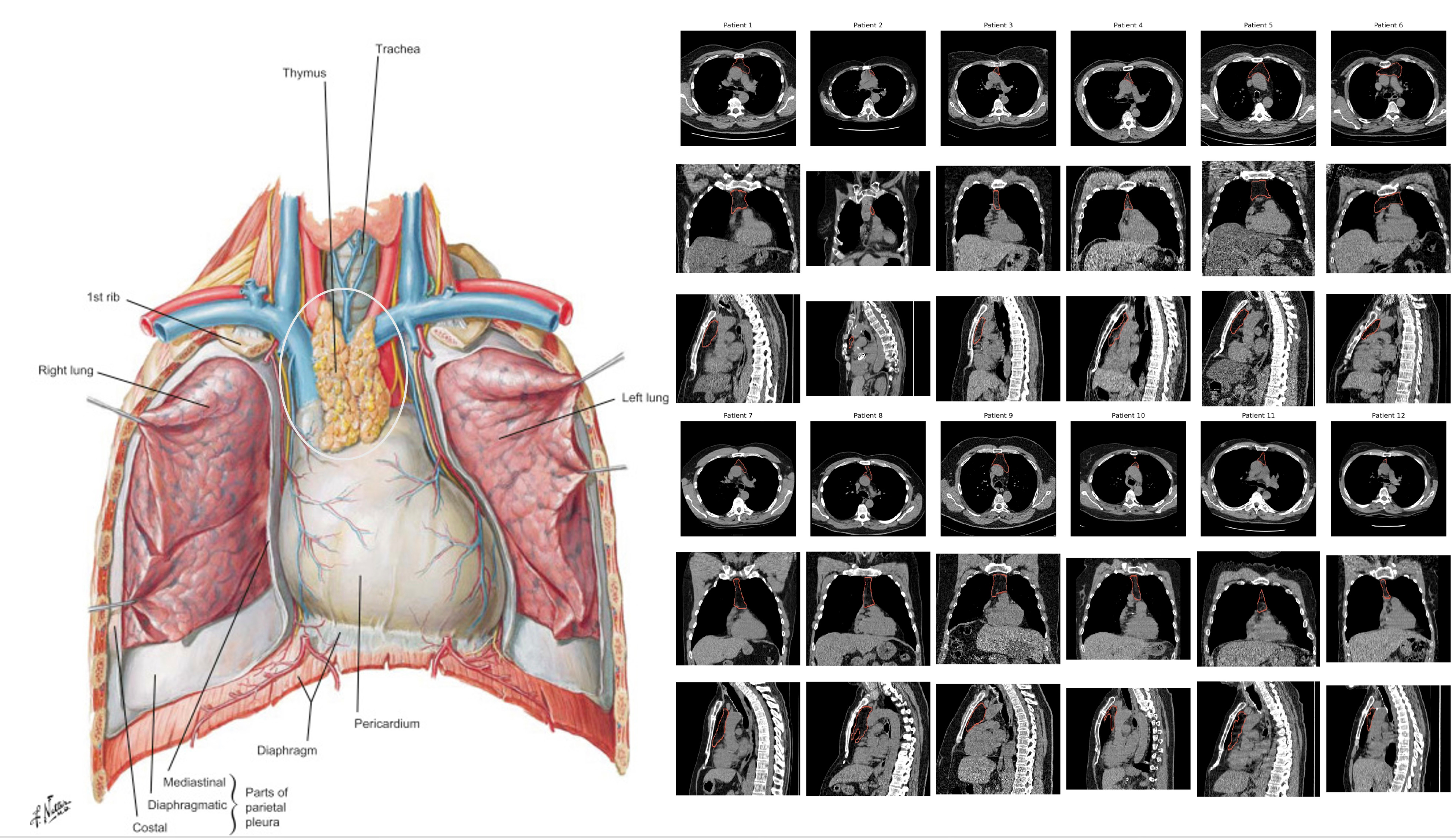 Our thymus gland plays a central role in the development of our immune system, specifically for supporting T cell development (how these cells got their name, maturation and differentiation in the thymus) and discriminating between self and foreign, non-self antigen proteins with production of dendritic cells. As we age, our thymus gland shrinks—the process known as involution—with progressive change from spongy to fatty tissue, with loss of functionality. But this process, with respect to timeline and extent, markedly varies from one person to the next. And to make things even more complicated, our thymus gland anatomy and precise location in the chest also is highly variable. So the famous Frank Netter diagrams from the 1960s (such as at left below) don’t capture the remarkable heterogeneity that a random set of 12 chest CT scans (below at right).