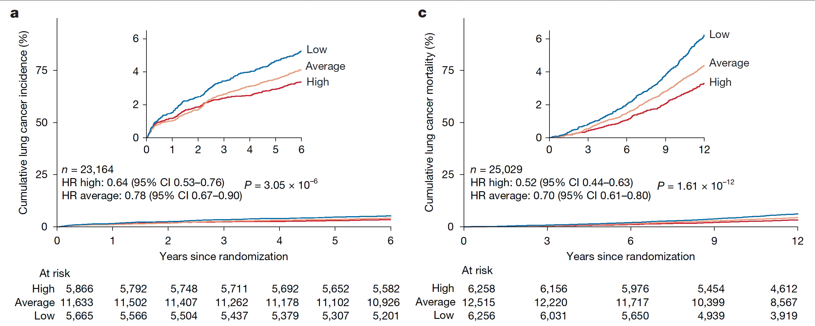 Lung cancer incidence was reduced by 36% for high vs low thymic health (Figure below, with a panel -incidence and b panel-mortality, adjusted for age, sex, BMI, smoking status). Notably, there was a smoker’s paradox: lower incidence and improved survival for lung cancer in smokers who had a high thymus health score.