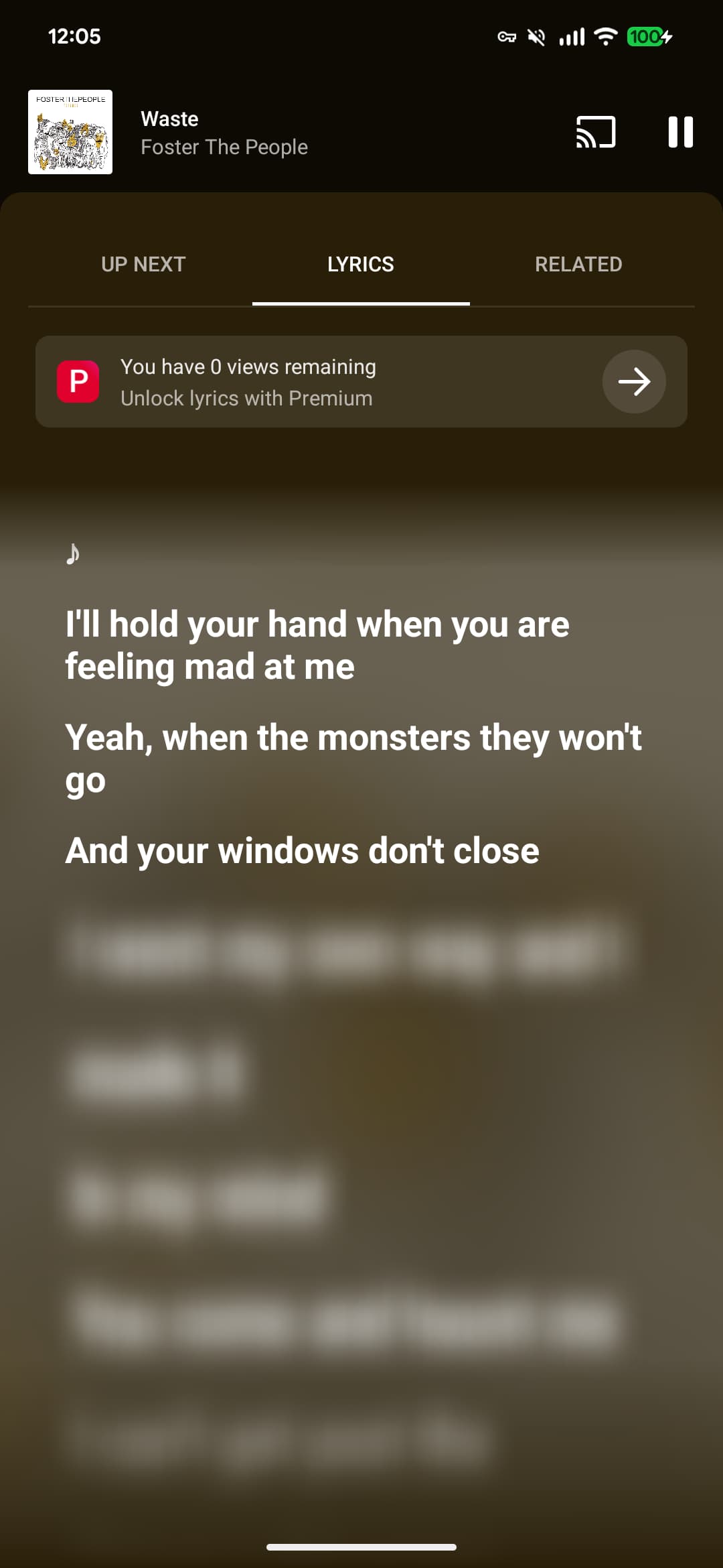 Lyrics in YouTube Music now require a YouTube Premium or Music Premium subscription. The middle tab in the Now Playing screen gains a new card at the top when this has rolled out to your account: “You have [x] views remaining” and “Unlock lyrics with Premium.”